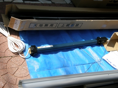 仮処理の状態ですが、シャッターボックス左上に、青いテープで貼り付けてあるのは、AC100Vの電気の線です。