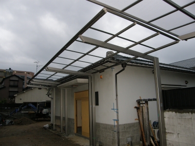 もう3連棟は軒下に 施工例 2012.07.142021.03.22 梁下を、資材を積んだトラックが通る予定です。 ですので、有効高さを最大2800mmに設定しています。 そうすると、母屋の軒下にはギリギリいっぱい! エントランス上にはひとつ低い庇があり、施工をさらに難しくしています。 ここは頑張りどころです!!
