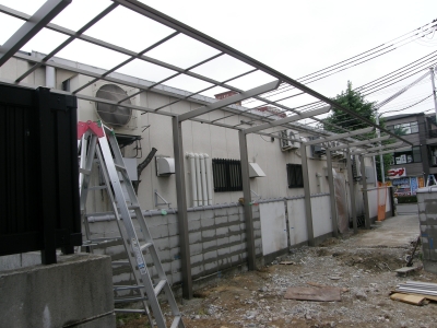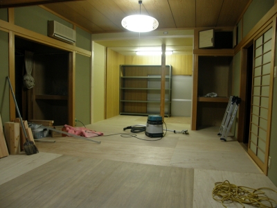 やっと3連棟 施工例 2012.07.132021.03.22 屋根を組んでいます。 ここまでの部分で縦3連棟です。 倉庫の中、床が張れて 広いスペースになりました! 少し、もったいない?!ですね(笑) 床をめくって、畳を入れなおせば、いつでも和室に戻せるように、 できるだけ、シンプルに施工しています。
