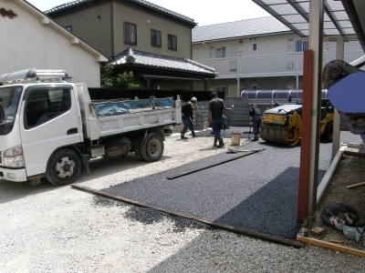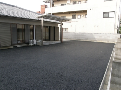 ガレージスペースは、透水性アスファルトで舗装しています。