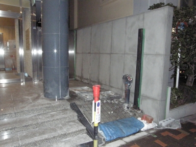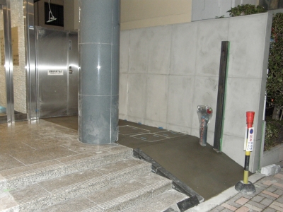 エントランスにスロープを 外構・エクステリア 2012.11.232021.03.28 テナントビルのエントランス、 袖の通路側に駐輪場があるのですが、 石張りの階段を乗り越えないと入れません。 そこで、スロープを作ります。 先ずは解体の上、設備点検口を据え替えて、土間下地! 土間を打ちました。 後ろの壁は、下シゴキをして調整しています!