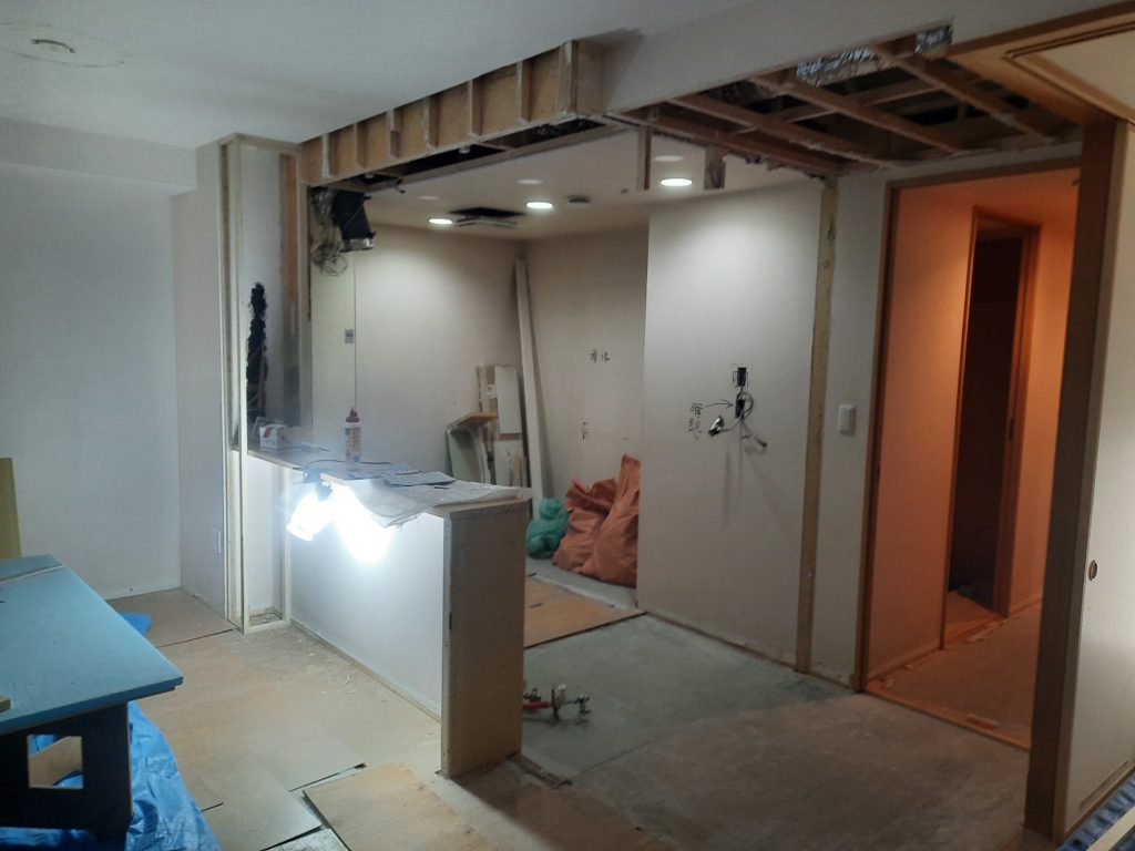 アッパーキャビネット(吊り戸棚)や間仕切り壁・垂れ壁を取り除きました。