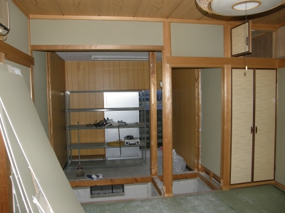 少しもったいない? 施工例 2012.07.042021.03.22 少しもったいないですが、母屋の中は 床の間の壁を破って、奥の倉庫とつなぎます。 床柱も抜いて、広くします。 既存の和室の畳は撤去して、床をバリアフリーでつなぎます。 実は、なるべく簡易な工事で、全体を広い倉庫としてお使いになるためです。 これ、キレイな床の間ですが 解体中 床は、根太組のうえ、コンパネ張。 床下にも収納スペースを設ける予定です。