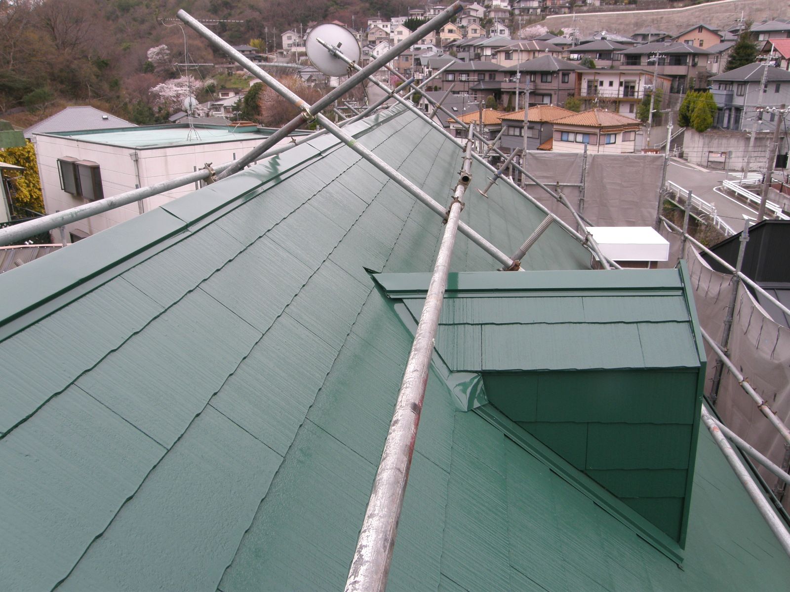 10寸勾配の屋根ですので、足場を架けていてもなかなかのキツさです・・・(笑)