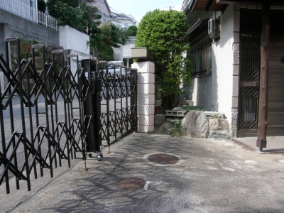 接道開口部は、伸縮門扉(アコーディオン門扉)で、