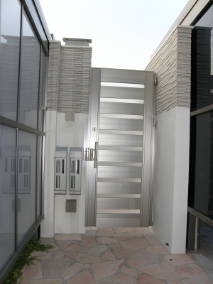 エルネクス門扉はH2000で、間にクリアマットのポリカが入ったタイプ。